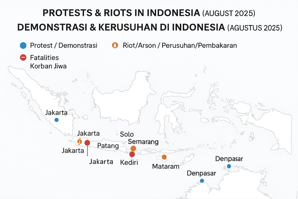 In the past two weeks of August 2025, Indonesia was rocked by nationwide demonstrations that escalated into the worst civil unrest in decades. At least five to six people were killed, hundreds were injured, and nearly a thousand were arrested amid clashes between crowds and security forces. Protests that began peacefully—triggered by a plan for a housing allowance of around Rp50 million per month (approximately USD 3,000) for Members of Parliament (DPR RI)—morphed into riots across multiple regions. The tragedy of a 21-year-old motorcycle taxi (ojol) rider, Affan Kurniawan, run over by a Brimob armored vehicle during a demonstration, further inflamed public anger after the video went viral.