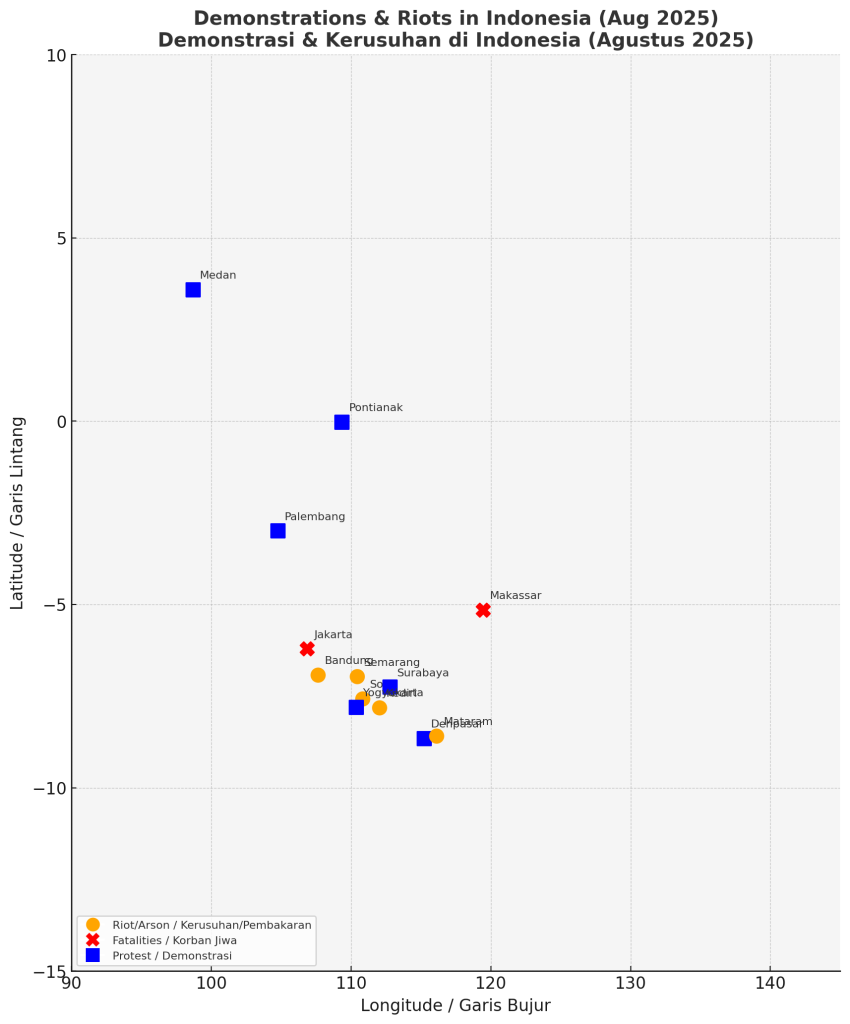 Graphic: Distribution map of protests, 25–29 August 2025, across Indonesian cities. 25/8 concentrated in Jakarta; 28–29/8 extended to Bandung, Medan, Semarang, Solo, Makassar, etc. (Source: ANTARA)